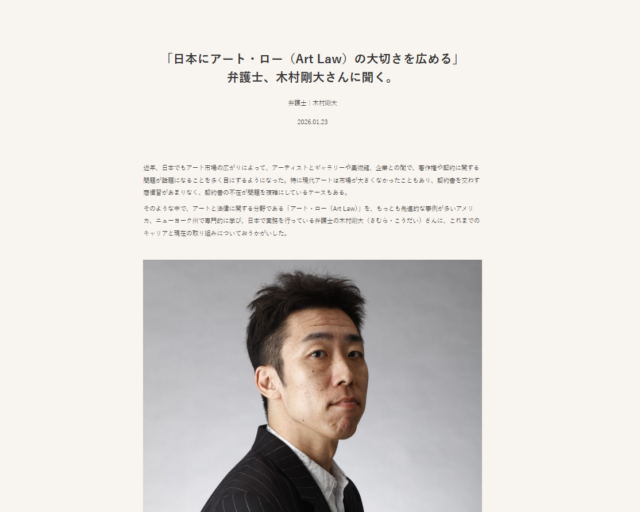 公益財団法人西枝財団が運営するメディアでアートと社会を創造的につなげる人を紹介している『+5』に、一般財団法人ヤノベケンジ財団の監事、木村剛大弁護士の取材記事が掲載されました。アートに関する法律((Art Law)を学んだ経緯と現在の活動がよくわかりますので是非ご覧ください。